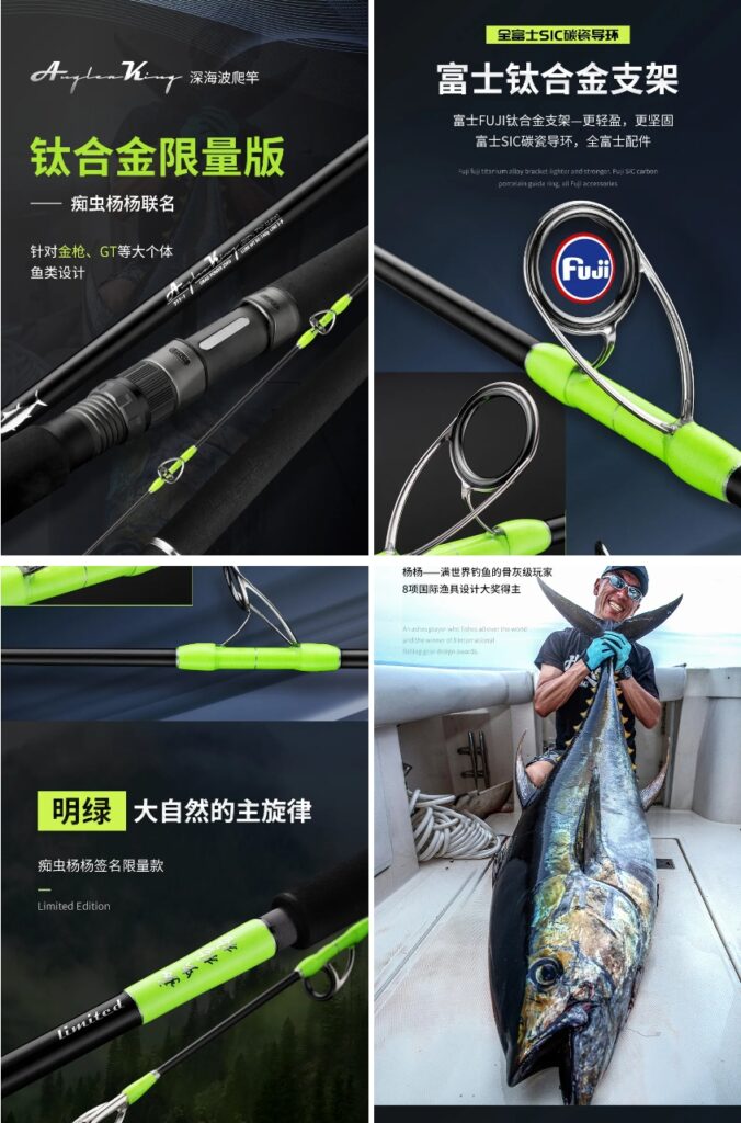 AnglerKing限量款船抛竿,带有痴虫杨杨签名,由杨杨老师监制;采用富士钛合金支架,保证了抛竿的轻盈和坚固,使得抛投更加轻松自如。其数量有限,具有较高的收藏价值。无论是对于专业垂钓爱好者还是收藏家来说,这都是一款值得拥有的精品。