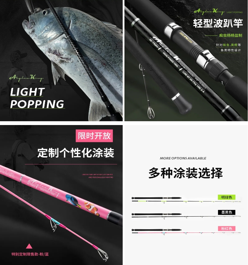 AnglerKing79MH+轻型波趴竿,轻型设计,使得在操作时更加轻便灵活。限时开放定制个性化涂装,多种涂装可选;采用富士SIC导环,饵重30-70g,针对马鲛、鲣鱼等鱼类特性设计。
