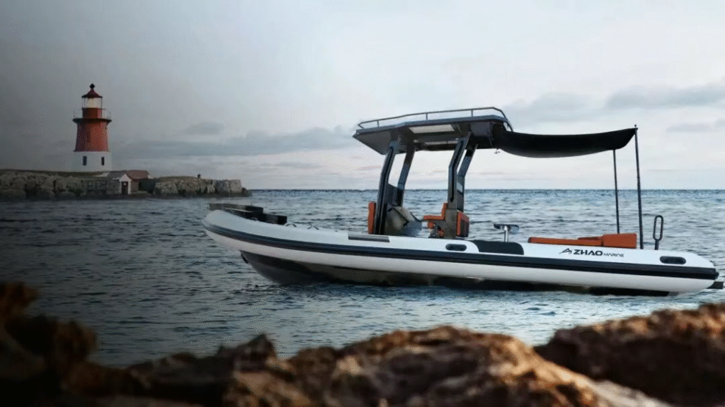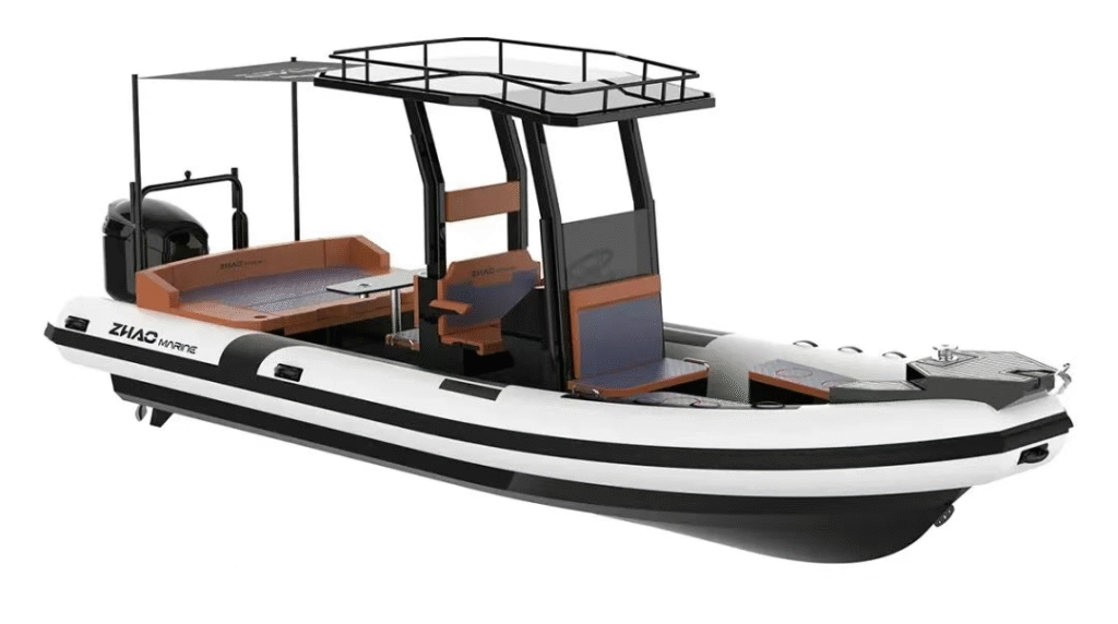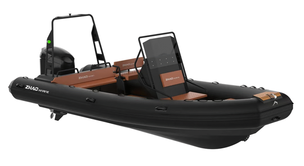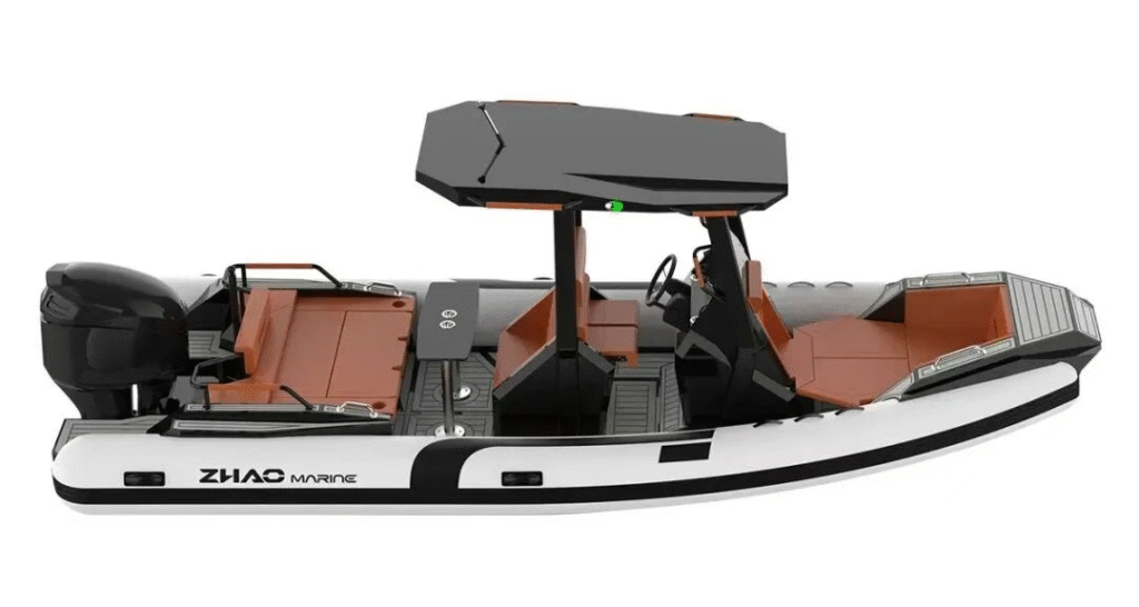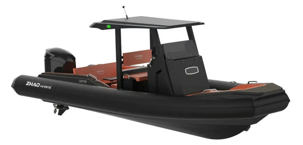 哑光黑船体点缀橙色线条,硬质顶篷集成专业航行灯系统。开放式社交布局与精致内饰细节,兼具充气船的便携性与游艇的精致感,适合湖泊巡航与短途接驳。
