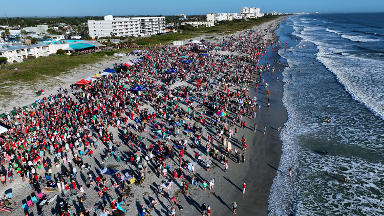 12月24日临近中午时,可可海滩呈现出一幅完全不同于常规冬季冲浪视察的景象。超过一万名观众挤满了海岸线及周边街道,许多人不得不将车停在将近一英里外,才能步行靠近沙滩。原因很简单,第十七届“冲浪版圣诞老人”盛会的时间到了。数百名冲浪者盛装出席,打扮成圣诞老人、精灵、雪人以及任何带有节日色彩的奇特造型。有些人划水出海搏击海浪,另一些人则留在岸边欢呼、跳舞、拍照,尽情沉浸在这独特的节日氛围中。音乐声此起彼伏,各式服装在阳光下熠熠生辉,欢声笑语无处不在。这是该活动历史上规模最大的一次人群聚集,将这一当地传统转变为佛罗里达太空海岸一场全规模的节日庆典。