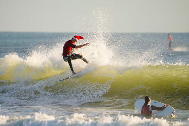 可可海滩为这个盛大的日子提供了近乎完美的天气条件。天空晴朗,最高气温达到76华氏度(约24摄氏度),使得即使在12月穿短裤也成为现实。“冲浪版圣诞老人”的精神继续传播到佛罗里达州以外。本赛季,希腊、苏格兰和荷兰等地也举办了类似的活动,那里的冲浪者穿着同样的红色 suits 在寒冷得多的水中划浪。尽管如此,可可海滩依然是这一切的核心。同一个海滩,数百个圣诞老人,数千名观众,以及一个每年都在变得更大、更响亮、更快乐的圣诞前夜传统。
