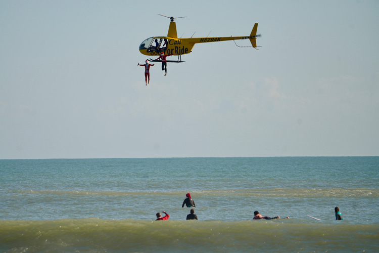 冲浪本身只是吸引力的冰山一角,“冲浪版圣诞老人”已演变成一场完整的节日奇观。今年的活动包括了著名的“圣诞老人直升机跳伞”,圣诞老人从天而降跳入大西洋,随后 catching a wave(驾驭海浪)。当红色的身影布满海面时,人群中爆发出阵阵欢呼。最令人热议的时刻之一是“SUPsquatch”(大脚怪立桨板)的回归,四名冲浪者同乘一块立式桨板出海。服装比赛再次带来了既混乱又充满创意的惊喜。过去的获胜者从经典造型的圣诞老人到流行文化角色如Cousin Eddie和芭比娃娃主题的参赛者应有尽有。在2025年,一位圣诞老人摘得桂冠。甚至还有一只名叫Spike的真鹦鹉出现在冲浪板上,这证实了对于这项活动而言,没有什么太过稀奇古怪。