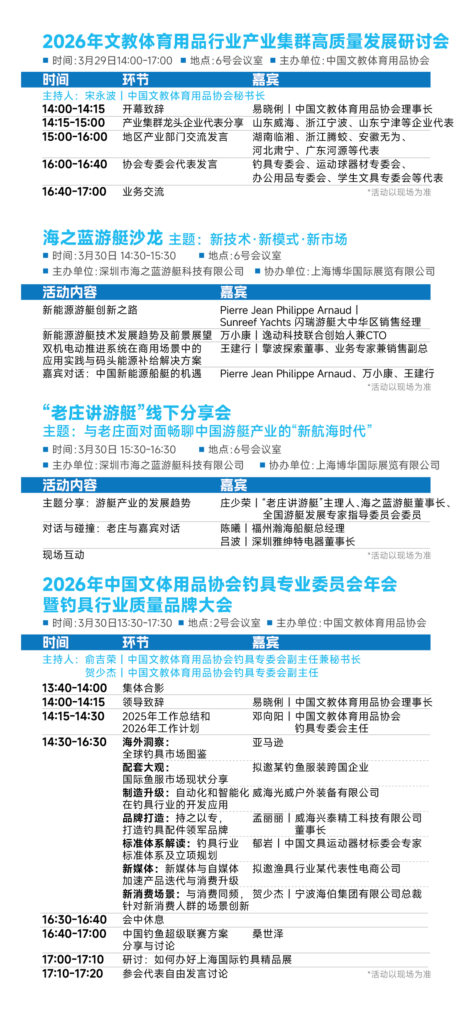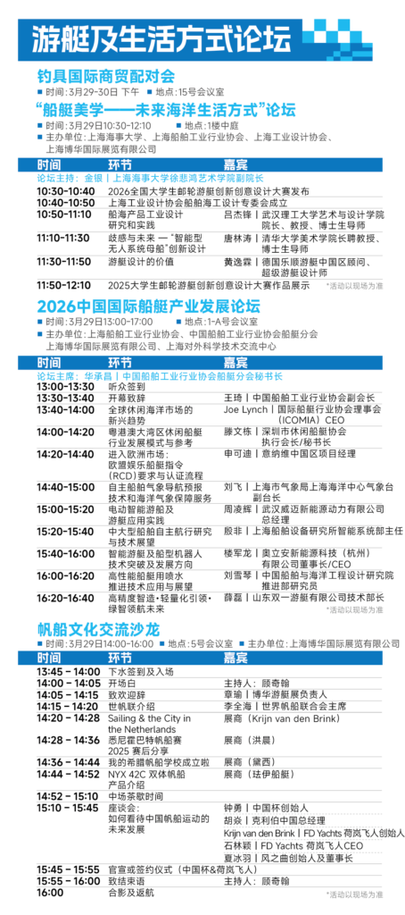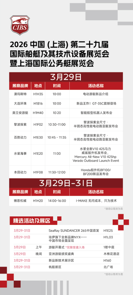 干货满满、链接资源、提升视野……包括展商新品首发、“船艇美学——未来海洋生活方式”论坛、2026中国国际船艇产业发展论坛、帆船文化交流沙龙、海之蓝游艇沙龙·老庄讲游艇、2026MatchmakingMeeting游艇展国际商贸配对会等在内的专场活动,让CIBS2026成为汇聚行业专家、资深从业者及意见领袖,分享前沿趋势、获取行业一手资讯的高质量交流平台!